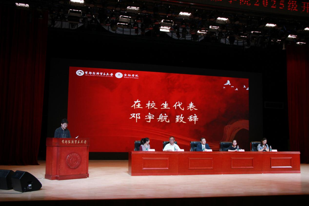 2025级金融工程一班吴若兮同学作为本科新生代表发言。她谈到,金融的本质是服务,是连接,是创造价值。我们要培养的不仅是专业技能,更是对社会责任的担当,对社会生活的关切。她呼吁同学们珍惜大学时光,用所学服务社会,用金融的力量让这个世界变得更加美好。