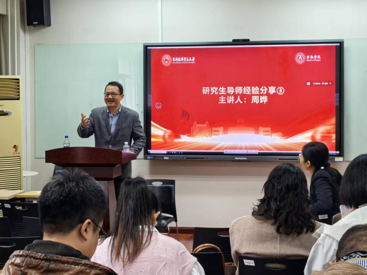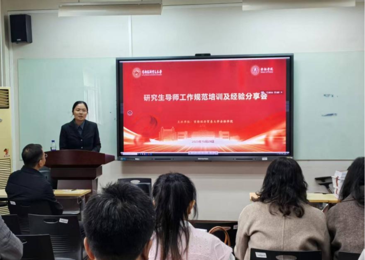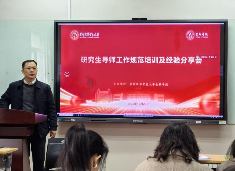 2025年10月29日下午,金融学院研究生导师工作规范培训及经验分享会在明辨304举行。周开国院长致辞,焦安琪、廉永辉、周晔三位老师分别分享硕博研究生指导经验,金融学院研究生导师参与学习,副院长赵大萍主持本次活动。