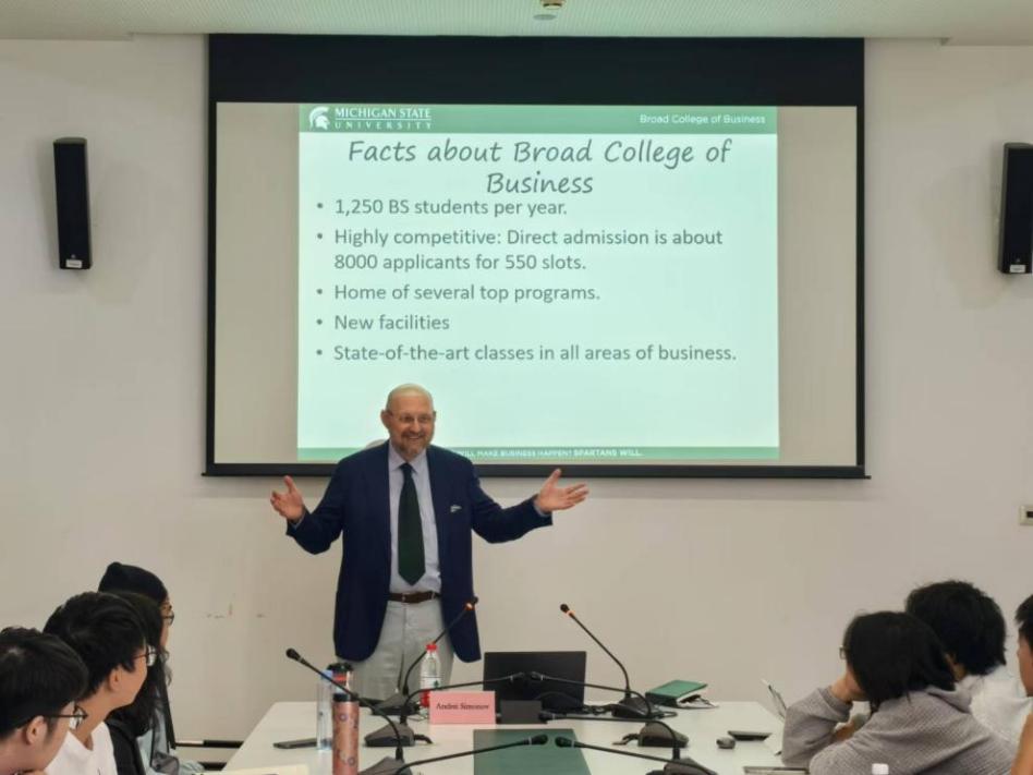 宣讲会上,Andrei Simonov系统地介绍了MSU商学院的办学历史、学科优势、师资规模与最新校园设施,并重点介绍MSU金融硕士(MS in Finance)项目与面向我院学生的“3+1+1”联合培养路径。同时,Andrei Simonov还展示了MSU商学院新增的《深度学习与神经网络》《金融科技》《投资银行与私募股权》等前沿热点课程模块。
