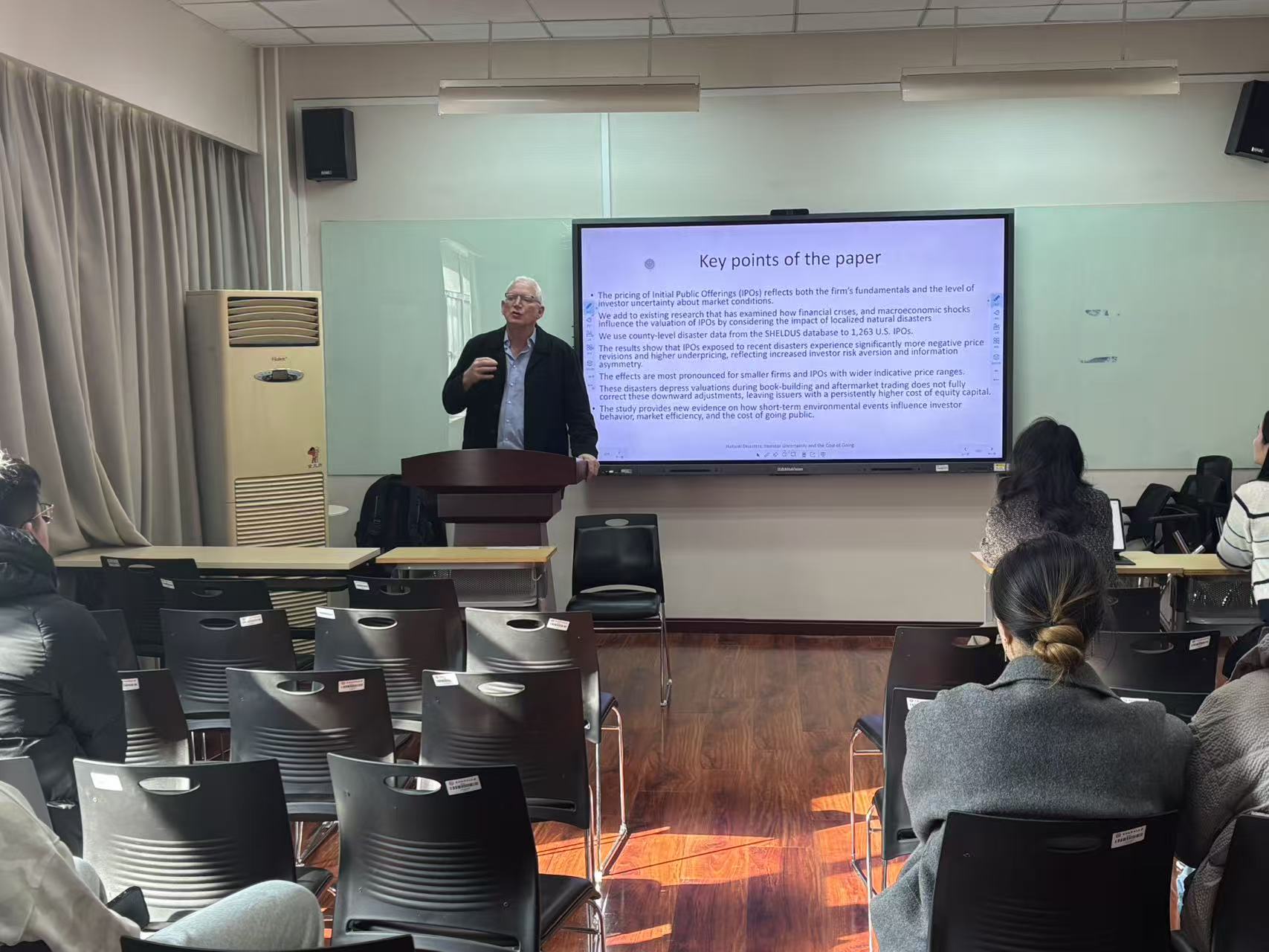 本次研讨中,乔纳森·安德鲁·巴顿教授以2001-2019年美国1263家IPO企业为研究样本,结合SHELDUS数据库的县级自然灾害数据,探究区域性自然灾害对企业IPO定价的影响及其机制。研究发现,IPO企业若在发行当月所在州遭遇自然灾害,会面临更显著的发行价负向修正与更高的抑价水平,且灾害强度越高,该负向影响越明显。这一效应在2010年后因投资者气候风险意识与ESG关注度提升而显著增强,对小型企业、指示性价格区间更宽的IPO企业影响尤为突出,同时自然灾害还存在空间溢出效应,邻州灾害也会抑制本地IPO定价。