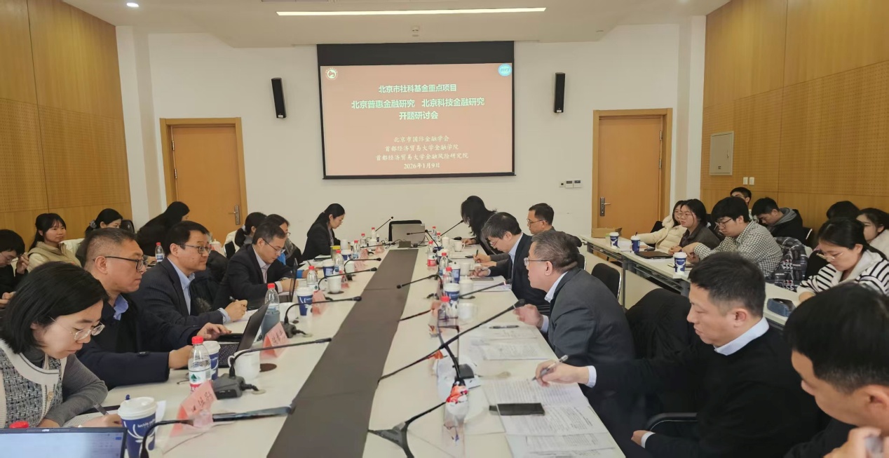 2026年1月9日上午,《北京普惠金融研究》、《北京科技金融研究》项目开题研讨会在首都经济贸易大学博远楼举办。研讨会由北京市国际金融学会、首都经济贸易大学金融学院、首都经济贸易大学金融风险研究院联合主办。首都经济贸易大学金融学院副院长赵大萍教授主持会议。金融学院院长周开国教授致欢迎辞。