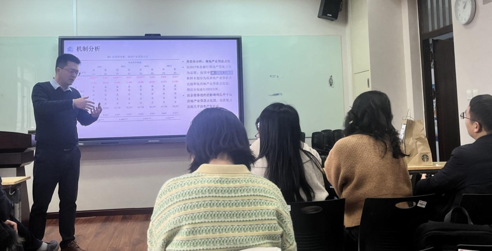 互动讨论环节,现场师生围绕研究细节展开热烈交流,针对数据处理、内生性、风险传导机制、区域溢出效应等问题与宫迪教授进行交流。此次研讨班的成功举办,不仅为师生搭建了高水平学术交流平台,更从微观层面厘清了房地产与银行风险的传导链条。在房地产、地方债和中小金融机构风险交织的背景下,该研究为防范化解系统性风险提供了扎实的实证支撑,对完善银行风险管理、优化房地产市场调控政策具有重要的学术参考与实践启示。