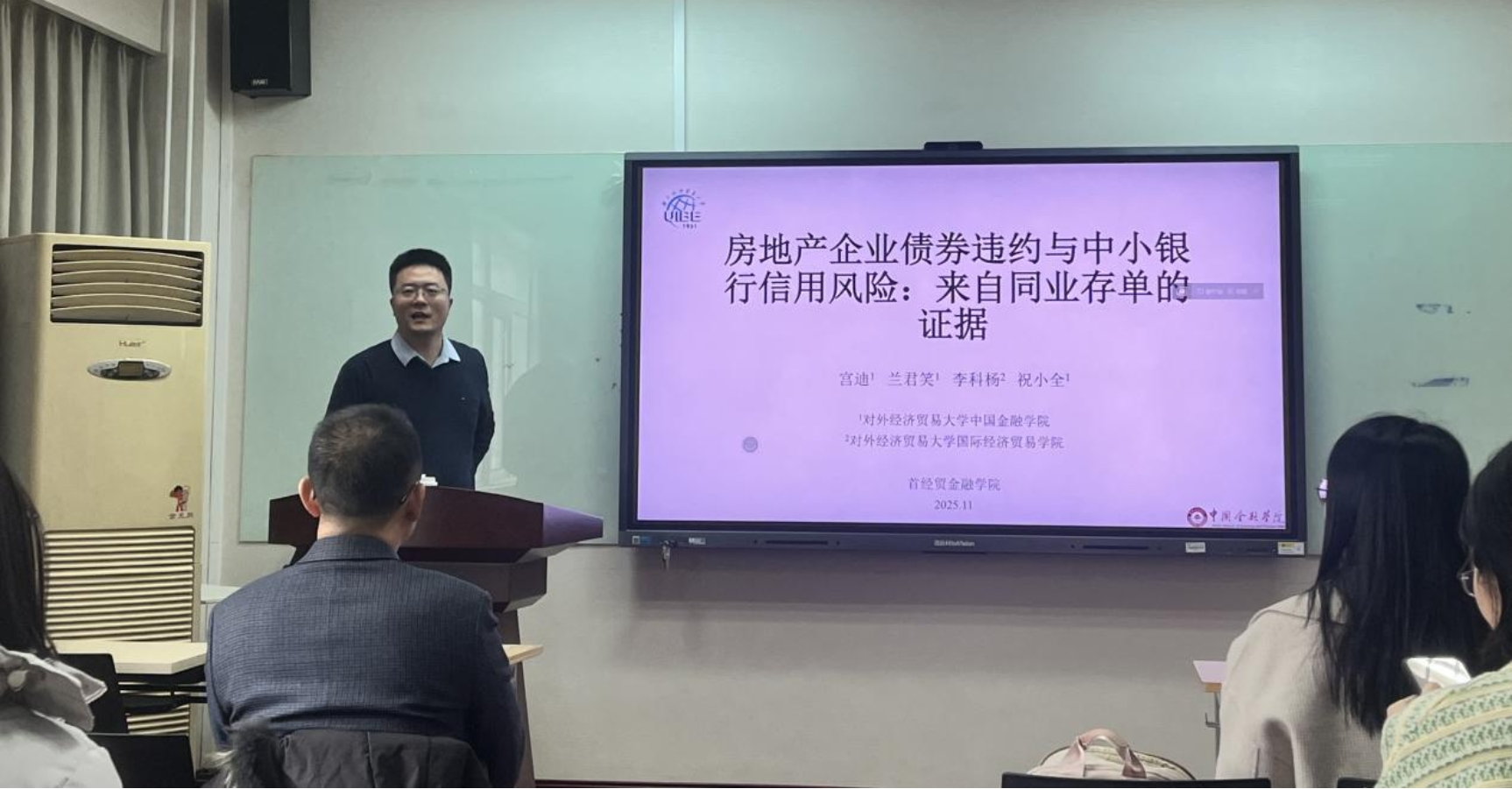 2025年11月26日12:30-13:30,首都经济贸易大学金融学院主办的首都金融论坛第217期暨论文研讨班第339期在明辨楼304顺利开展。本次研讨以“房地产企业债券违约与中小银行信用风险:来自同业存单的证据”为主题,特邀对外经济贸易大学中国金融学院宫迪教授担任主讲人,金融学院师生齐聚一堂,围绕研究设计、数据处理、结论应用等核心议题展开深入探讨,共同探究房地产风险向金融体系传导的内在逻辑与治理启示。会议由陈里璇老师主持,金融学院周晔、何枫、王韧、张璐、王姝勋、廉永辉、马思超、刘怡君老师及研究生共同参与,现场氛围热烈,互动研讨氛围浓厚。