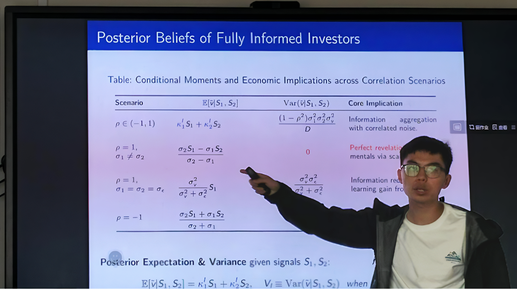 模型设定部分,主讲人详细阐释研究设计。模型包含风险资产与无风险资产两类资产,假设标准化数据与另类数据的噪声项存在相关性,贴合现实中共同偏差影响的客观规律;市场分为三类投资者:可同时获取两类数据的完全知情投资者、仅能使用标准化数据的部分知情投资者,以及纯粹噪声交易者,通过噪声交易设置避免价格完全泄露另类数据信息,保证模型逻辑严谨。