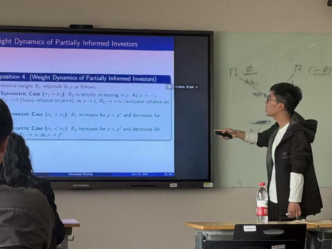 在投资者行为与均衡分析中,主讲人结合理论推导与图表结果,揭示核心结论:完全知情投资者可通过双信号交叉验证、抵消噪声,获得信息多样性溢价;信号间相关性越高,信息冗余度越高,投资者对资产未来回报的估计效果越差,后验方差随之上升;当信号精度存在差异时,存在特定阈值,此时另类数据完全冗余,无法提供增量信息。同时,拥有另类数据的投资者比重越高,价格信息含量越充分,未持有另类数据的投资者可通过价格学习,降低估计不确定性。