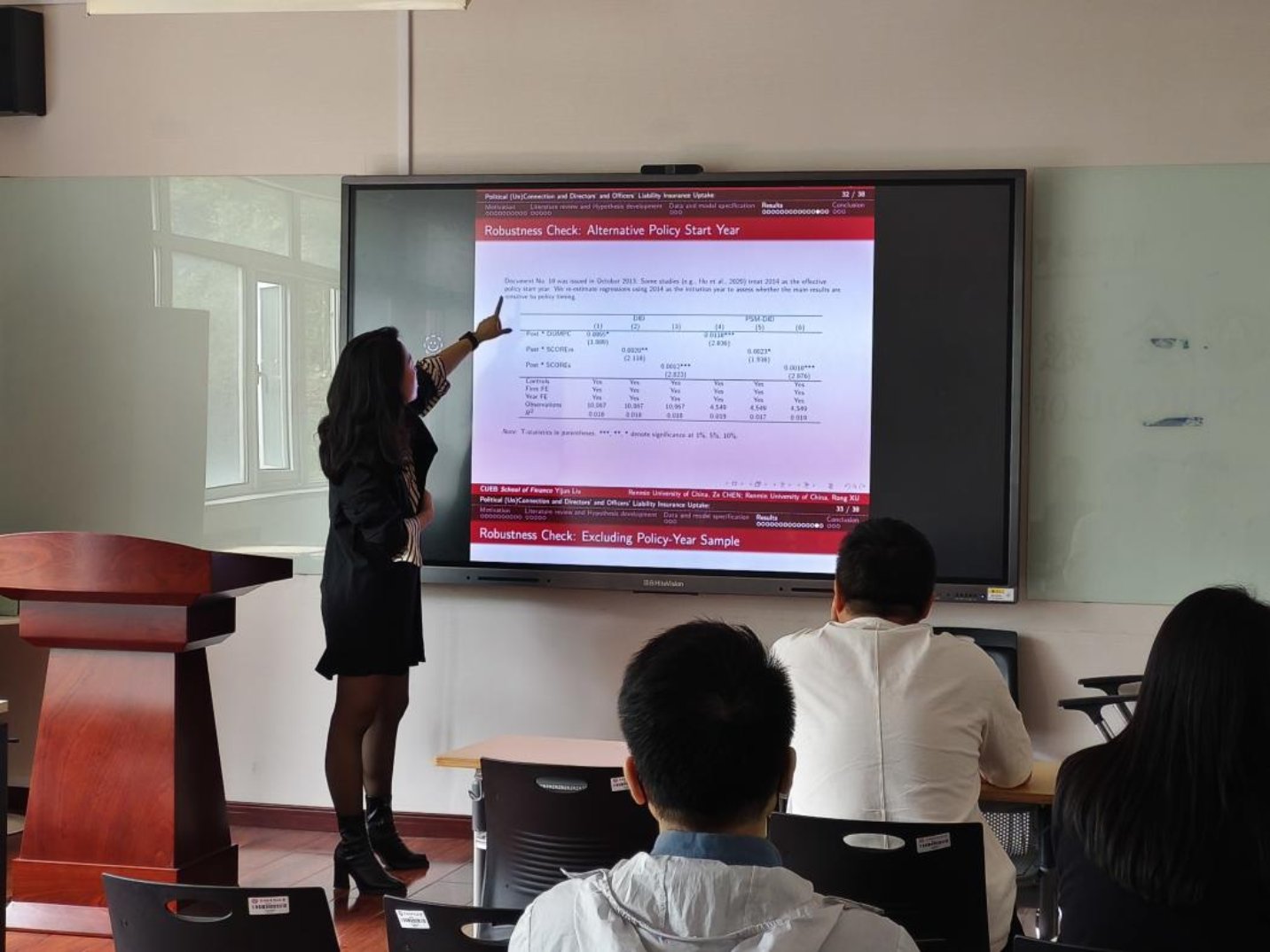 2025年9月17日下午,由首都经济贸易大学金融学院主办的论文研讨班第328期在明辨楼304会议室顺利举行。本期研讨班特邀首都经济贸易大学金融学院刘怡君博士担任主讲嘉宾,就“政治关联与董监高责任保险需求:来自中国政策冲击的证据”这一主题与师生们展开了深入交流。金融学院焦安琪、马彪、郑宁等多名教师以及10余名硕博研究生参加。