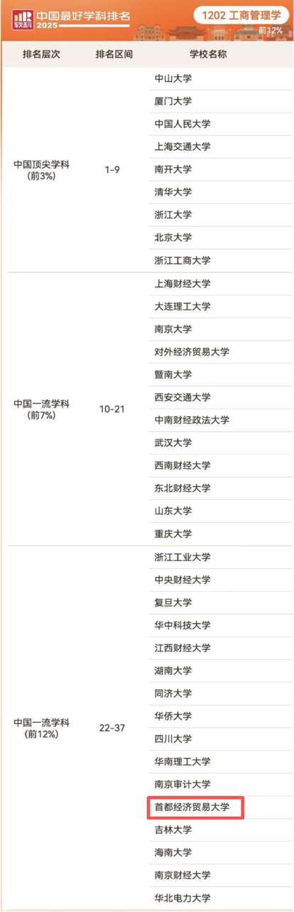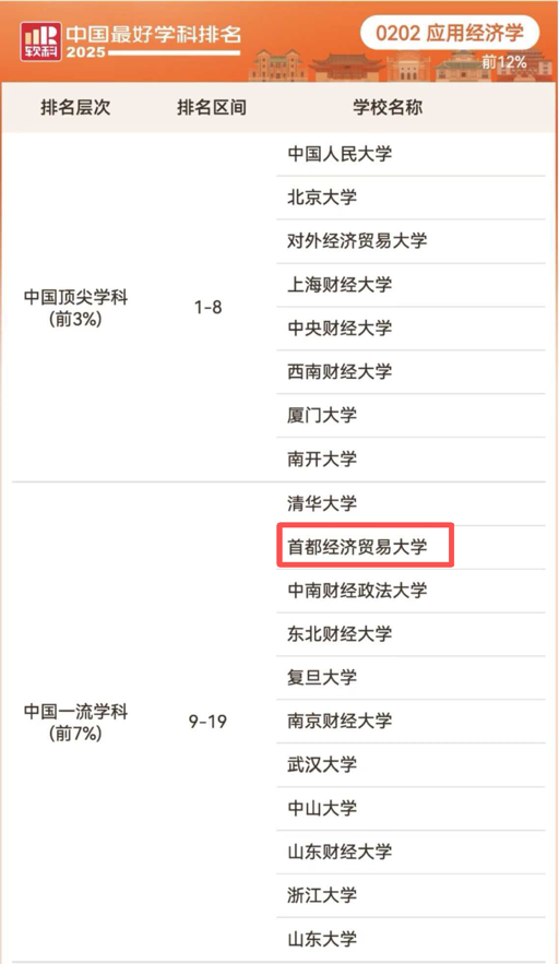 刚刚高等教育评价机构软科正式发布“2025软科中国最好学科排名”首经贸7个学科上榜其中应用经济学首次跻身全国前十!