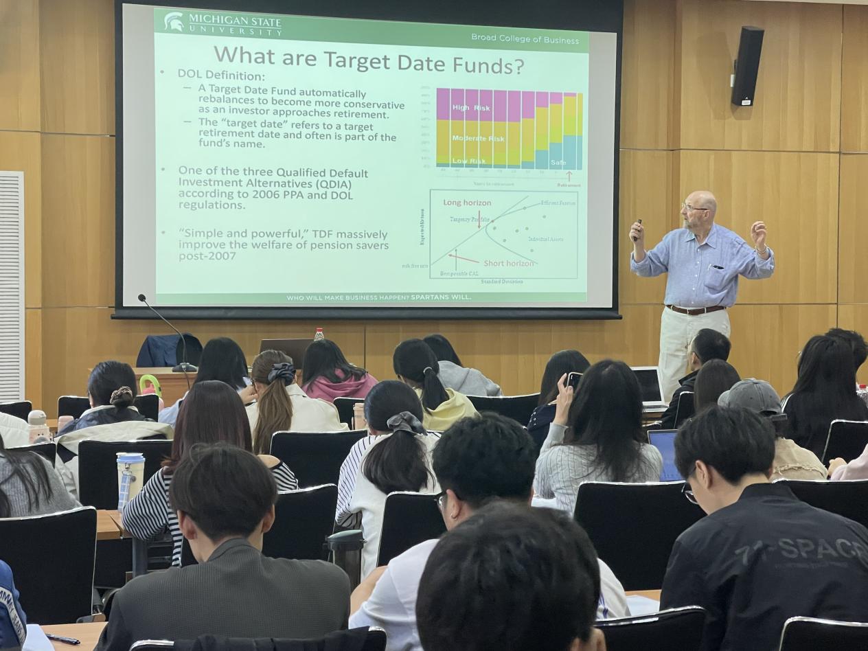 在互动讨论环节,金融学院多位教师围绕“目标日期基金在不同养老金体系下的适配性”“如何通过监管政策约束基金家族的关联交易行为”“投资者教育对改善目标日期基金投资体验的作用”等问题与安德烈·西蒙诺夫教授展开深入交流。教授结合美国市场实践与全球多国药例,针对中国养老金第三支柱发展中目标日期基金的潜在应用场景提出建议,认为需从“强化基金费用透明度监管”“建立基于长期业绩的基金评价体系”“引导投资者树立长期投资理念”三方面发力,推动目标日期基金市场健康发展。现场研究生也积极提问,就“目标日期基金资产配置模型的优化方向”“新兴市场中目标日期基金的风险控制策略”等学术问题与教授探讨,进一步深化了对主题的理解。