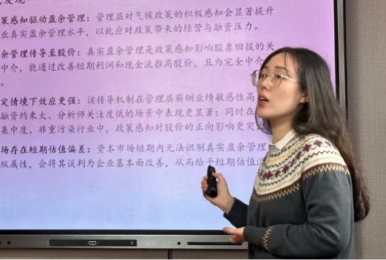 论坛学术报告环节分为上下半场。上半场由国际金融系党支部书记唐伟霞主持。上海对外经贸大学姚澄雪报告了《管理层气候政策感知、真实盈余管理与公司股票回报》,该研究运用文本挖掘与FinBERT模型构建管理层气候政策感知系数,深入探讨了三者间的影响机制;首都经济贸易大学张路报告《算力基础设施如何推动企业数字创新——基于人工智能专利的微观经验证据》,以固定效应模型为基础,采用工具变量法(IV)和双重差分法(DID)策略进行因果识别,发现算力中心的建设显著提升了企业的人工智能专利申请数量;上海对外经贸大学田汝彦报告《地方政府债务治理与企业高质量发展——来自地方政府债务管理体制改革的证据》,利用双重机器学习模型检验了债务治理对企业高质量发展的影响及作用机制。首都经济贸易大学张路、上海对外经贸大学王雯岚、首都经济贸易大学廖毓分别对上述报告进行了点评。