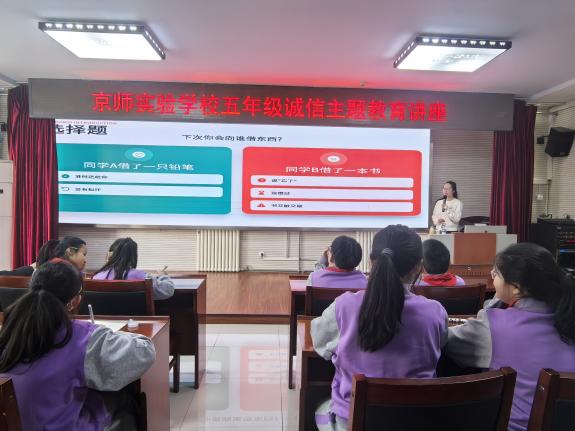 任幸子、吕琳两位老师分别赴京师实验学校、大峪二小讲授讲授《诚信伴我行》课程,通过诚信小故事形象地帮助同学们了解金融信用、树立诚信意识。