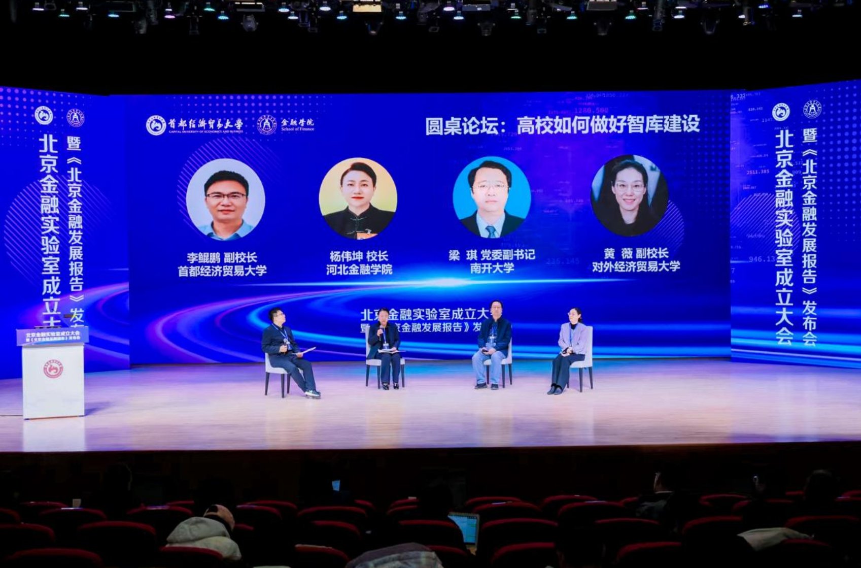 圆桌论坛由首都经济贸易大学党委常委、副校长李鲲鹏主持,南开大学党委副书记梁琪、河北金融学院校长杨伟坤、对外经济贸易大学副校长黄薇等嘉宾,围绕“高校如何做好智库建设”主题展开深入对话,分享了各自在智库机制创新、成果转化与人才培养方面的实践经验。