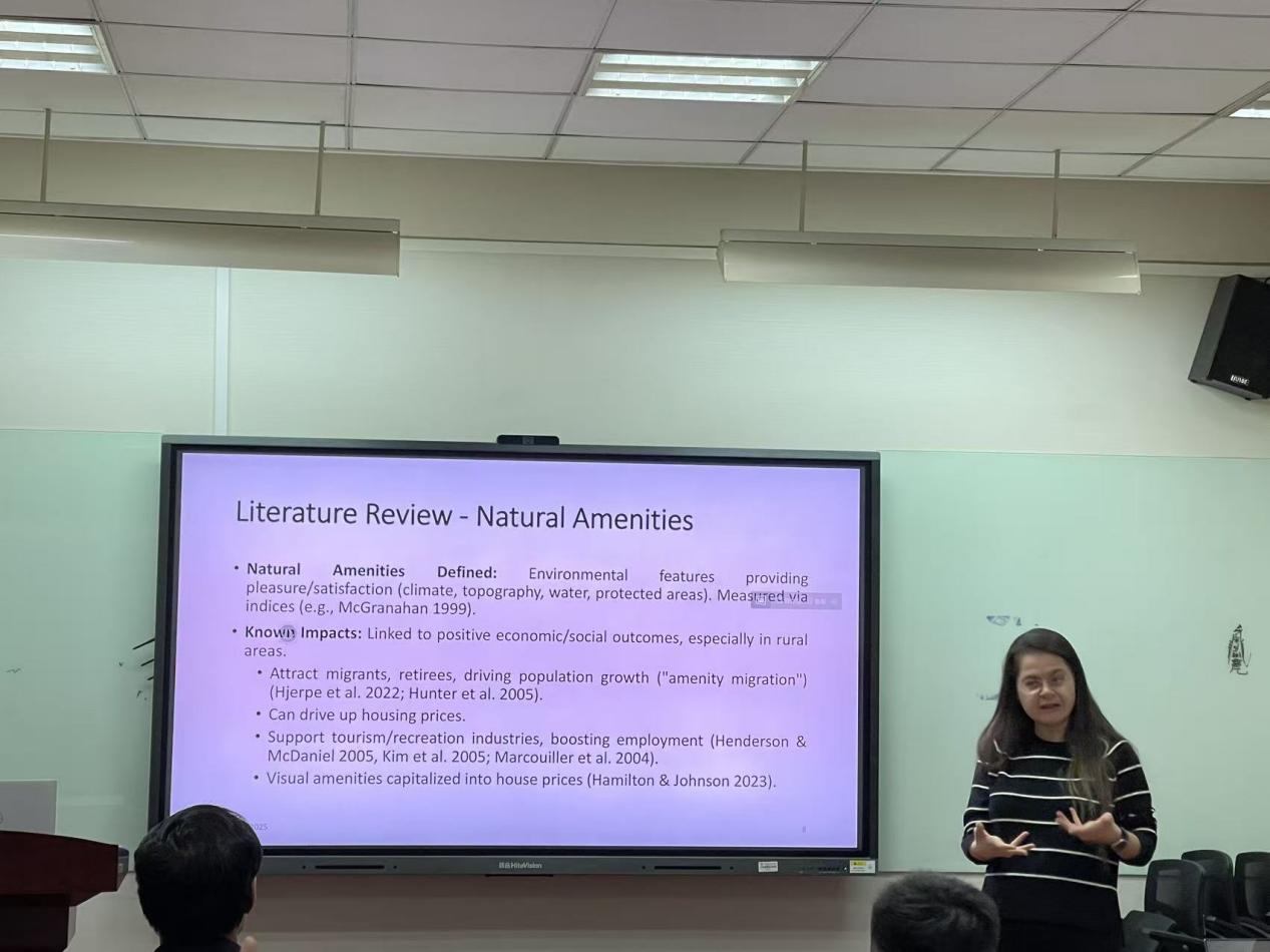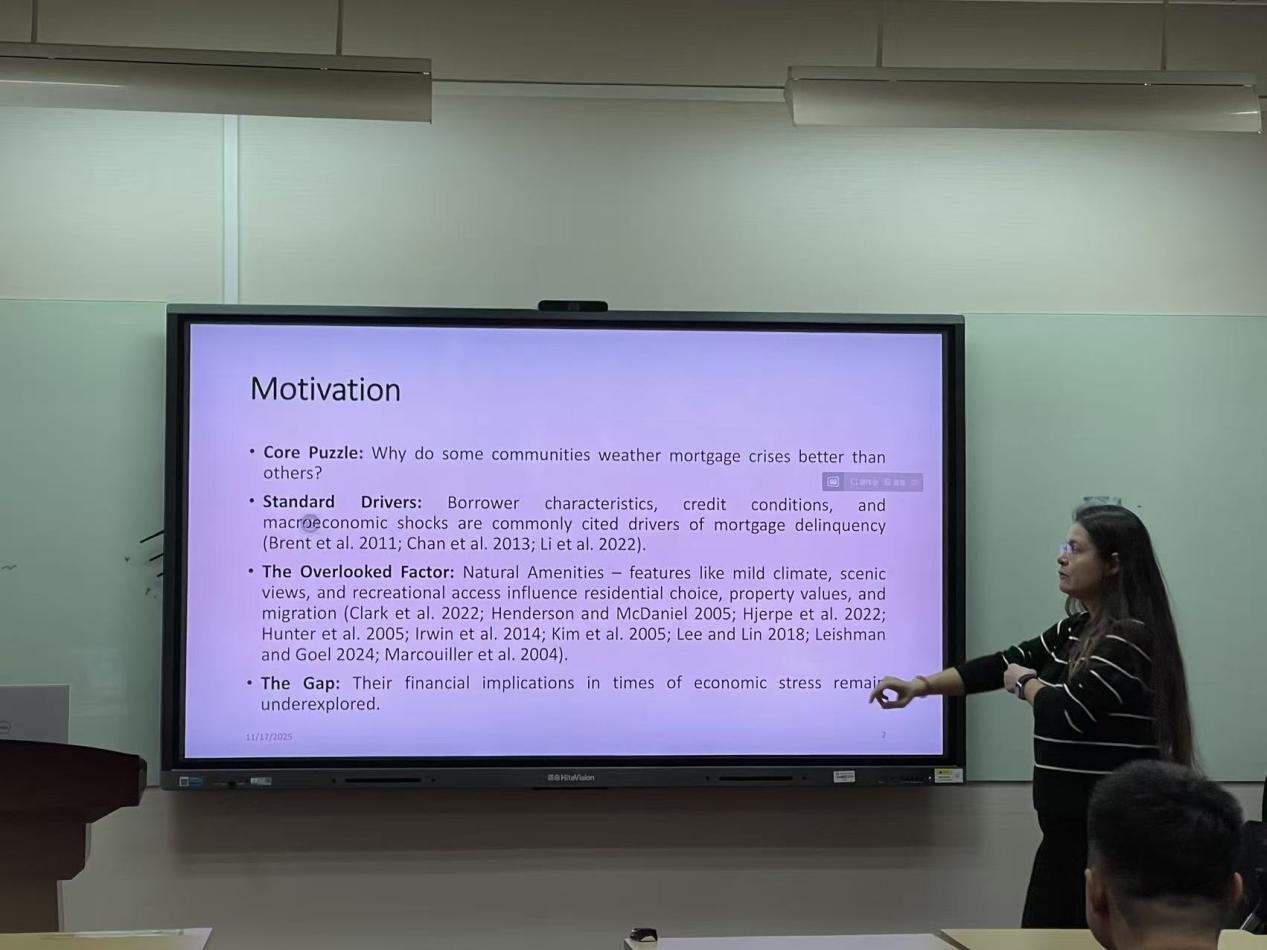 2026 年 1 月 7 日(周三)12:30-13:30,由首都经济贸易大学金融学院主办的首都金融论坛第 223 期暨论文研讨班第345期在明辨楼 304 教室成功举行。本次研讨活动以 “从稳定到风险:自然禀赋对抵押贷款的影响变迁”(From Stability to Risk: The Changing Impact of Natural Amenities on Mortgages)为核心主题,特邀加利福尼亚多明尼克大学金融学副教授阿斯利汗・吉泽姆・科尔克马兹(Aslihan Gizem Korkamz)博士担任主讲人,本次研讨由赵大萍副院长主持,陈里璇、刘贤达等多名教师及20余名硕博研究生线下参加。学院师生通过线下参与的方式,围绕自然禀赋与抵押贷款绩效的关联机制、金融危机前后的影响变迁等议题展开深度学术交流,现场研讨氛围热烈而浓厚。